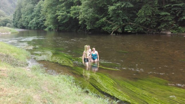 Byl by hřích stát u soutoku Kamenice s Jizerou a nevlézt tam. Zkraje se někteří ostýchali, ale vedro je dohnalo k ovlažení, byť i s holou zadnicí!!!!!!!