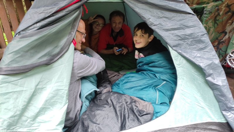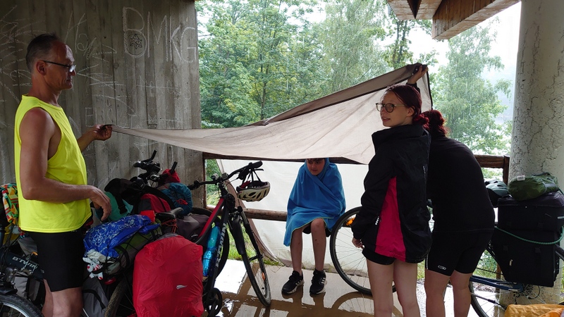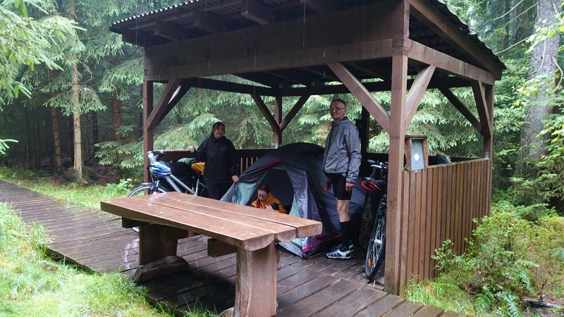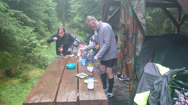 Do přístřešku teklo, z čímž si hravě poradil Vláďa a pomocí větví upravil sklon střechy. Upravilo se umístění lavic se stolem, jenž musel ven. S koly se vešli všichni, ba dokonce přiběhli i dva němečtí turisté. Když se počasí neumoudřilo rozevřeli deštník a odešli. To byl signál pro nás. Využili jsme volného prostoru a postavili do něj jediný stan. Vladimírův působil největším dojmem a namačkalo se nás různě pokrouceno všech pět.