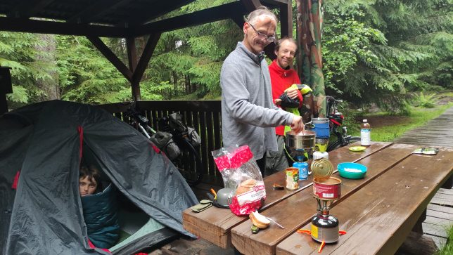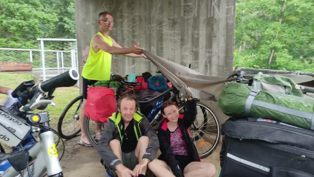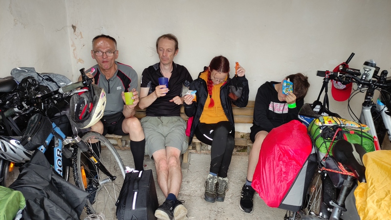Ti se dostavili s natrhanými třešněmi jen tak tak, neboť z nebe opět padala voda. Uvařili jsme si jídlo, kávu, najedli se, popovídali s cestující, jenže venku déšť stále padal.
