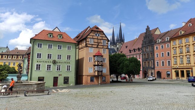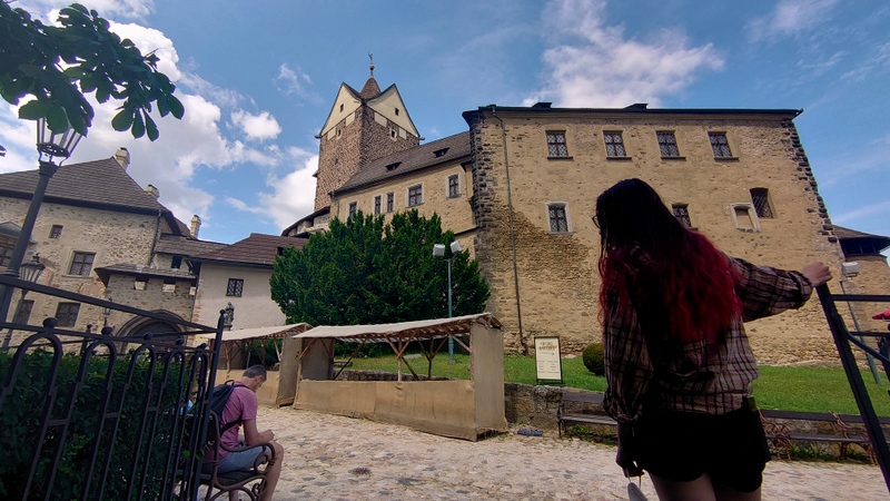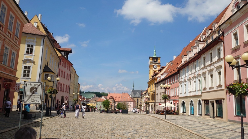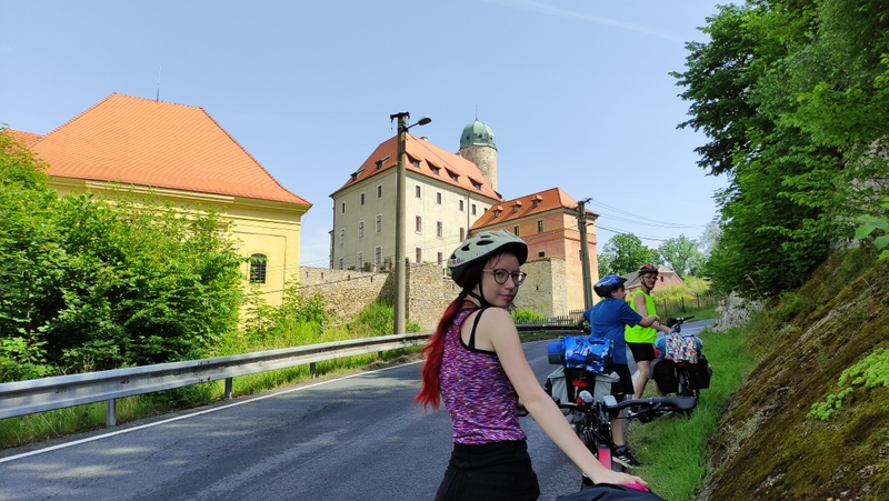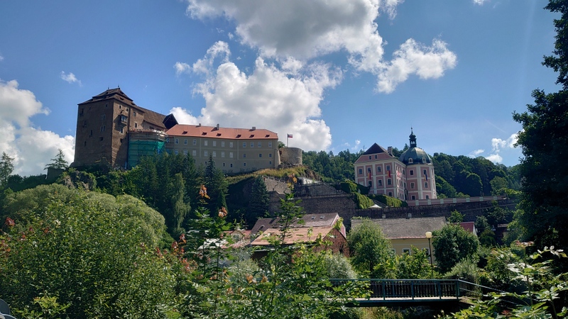 Opřeli a uzamkli jsme kola o hradby, abychom si městečko prohlédli co nejlépe vystoupali jsme po hradbách, na nichž se konala výstava kreseb na téma knihy Julesa Verna. Dostali jsme hlad, který se zkrotil na náměstí v restauraci  Hotelu Goethe. S plnými žaludky jsme přemýšleli jak dál. Anežka chtěla navštívit ve Varech oblíbený hotel Pupp s procházkou celým městem, já uvažoval o hradě. Vrátili jsme se ke kolům a rozjeli se podél rozvodněné Ohře po modré značce do Karlových Varů.