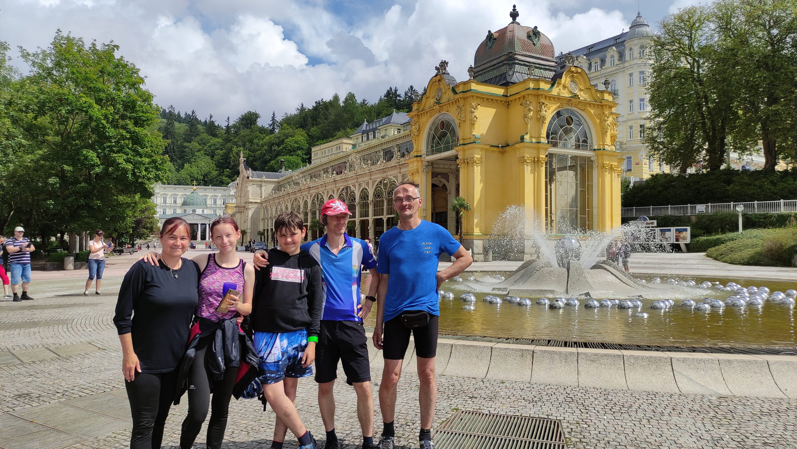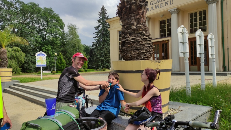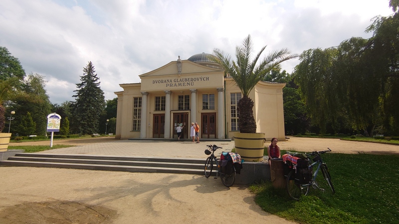 Polojasné počasí přálo prohlídce velkých altánů vystavených na počest léčivých pramenů jako např. Rudolfův, Karolinin pramen, Křížový pramen a mnoho jiných. Čas tlačil trojici k odjezdu na vlakové nádraží, na němž jim odjížděl spoj na Cheb ve 12.16, neměli tedy tolik příležitosti pokochat se krásou staveb. Naopak, jak jsem později slyšel, postihla je jiná komplikace, při níž jsem se musel usmívat. Když dojeli s koly na nádraží zadali si koupě jízdenek na Liberec přes Cheb. Horlivá pokladní jim nabídla pozdější vlak ve 12.54, jestli chtějí přes Prahu, že je vlak údajně rychlejší než přesedat v Chebu a dále v Ústí nad Labem. Než se rozmysleli současný spoj ujel. Se změnou přes Prahu souhlasili, načež platili každý za sebe kartou. Vznikly další potíže. Paní pokladní musela vystornovat jízdenky, jež špatně vydala. Paní nešlo zadat kolo jako spoluzavazadlo. Nervózní fronta se rozrostla o další cestující. Nakonec ji pomohla jiná pokladní a kluci na peroně mohli nakládat kola s brašnami. Železniční trasa Mariánky, Plzeň, Praha přestup -Praha, Ústí n/L. Závada na trati před Ústím, přestup na Liberec. Předpokládaný příjezd po 21 hodině se samozřejmě nekonal – porucha na trati … Ani jsem nechtěl vědět v kolik dorazili domů.