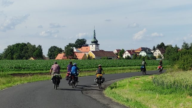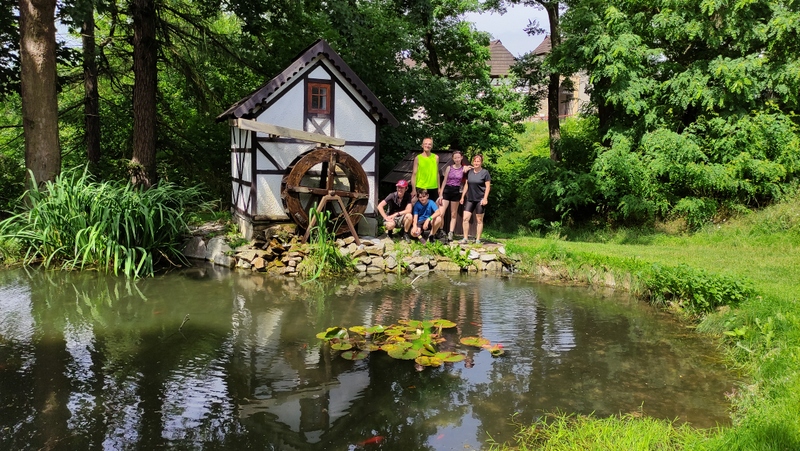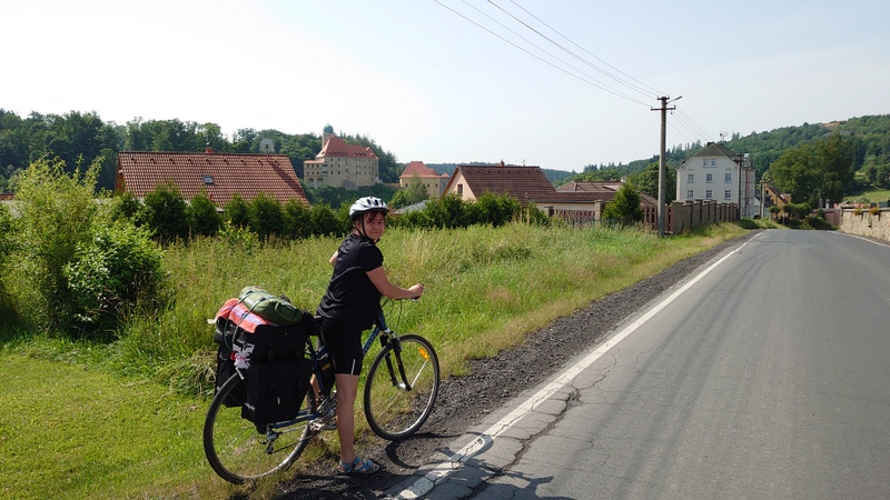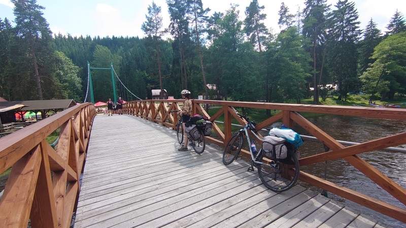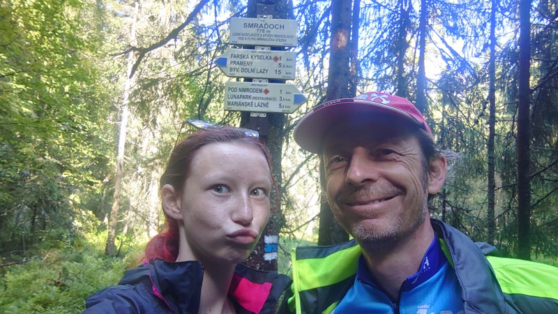 Letošní červencovou dovolenou na kolech naplánovala Šárka s touhou podívat se do západních Čech po lázeňských městech a zároveň doplnit další kamínek do mozaiky ohledně nejdále položených bodů České republiky. Počasí se tentokráte povedlo zhruba půl na půl, ovšem plně odpovídalo tématu cyklistiky v kopcovitém terénu. Úmorná vedra se nekonala, spíše jsme trpěli vlhkostí způsobené dešti. Zúčastnilo se sedm členů party, z níž celý zamýšlený okruh dokončili dva jedinci. Vladimír se synkem si naplánovali odjezd ve čtvrtek, aby stihli sobotní skautský tábor. Dodám ještě na začátek, že ač putování vymyslela Šárka, byla mozkem akce, kudy a kam aktuálně jet pověřila mne, poněvadž jsem na kole měl přidělán držák na mobil s přehledem map. Samozřejmě toto neustálé hlídání trasy bralo telefonu dost energie, proto jsem se vybavil mohutnou power bankou uschovanou pod rámem v kapsičce. Na druhou stranu mne to vyřadilo z okamžitého natáčení a focení.