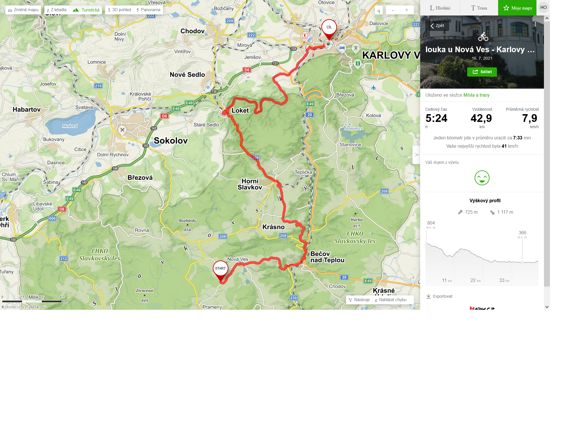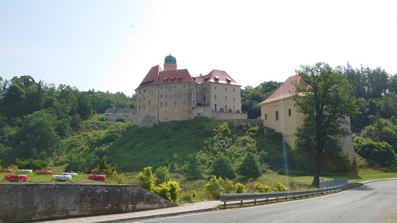 Zámek – hrad se vyjímali na vysokém ostrohu nad řekou Teplou poutajíc pozornost každého projíždějícího cestovatele po hlavní silnici. Blížila se 11 hodina a my neznali trať, pohyb nevyzpytatelného počasí ani počet kilometrů před sebou, zanechali jsme relikviář Sv. Maura na zámku svému osudu s touhou dojet k hradu Loket. Stejně tak dopadla podivuhodná rozhledna na Krásenském vrchu, kterou jsem toužil navštívit. Její poloha směřovala na protější stranu než jsme potřebovali. Přesto jsme z hlavní pohodlné silnici vedoucí 22 km do Varů odbočili na dlouhý táhlý klikatící se kopec, jenž jsme šli pěšky ve stínu stromů snad celou hodinu. Zpocení jsme se vyškrábali na vršek, po němž jsme projížděli otevřenou vrchovinou s pohledem na Krušné hory k bývalé hornické obci Horní Slavkov. Na náměstí byla před námi cedule s označením Loket 8 km po hlavní. Proč ne, řekli jsme si. Že pojedeme celou dobu stále z kopce to nás ani nenapadlo. S rozpálenými brzdami následovala dvojic jinou dvojici a tvořila cyklistický peleton. Auta se jen místy odvážila předjet odvážné cyklisty.