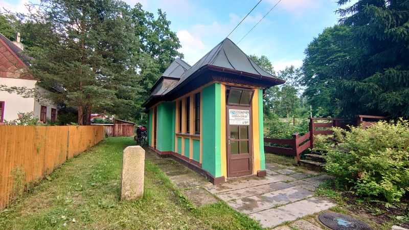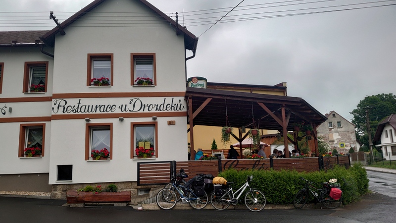 Ceny jídel vyšší, protože se nad námi se rozpršelo , nebylo co řešit. Objednali jsme si polévky, dětské porce hotovek a čekali na okno na odjezd na západ. V tu chvíli nám chybějící dvojice oznámila, že výpravu vzdávají a vracejí se domů opravit elektrokolo. Nezbývalo než se smířit s osudem.  Po zhruba dvou hodinách nastalo menší přerušení přeháněk, nelenili jsme, dokoupili zásoby a rozjeli se do kopců na Skalku a Výhledy. Dojel jsem se Štěpánkem ke zděné zastávce ve Výhledech a čekal na ostatní.