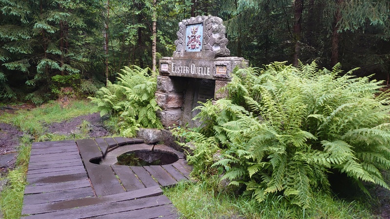 Rozhodlo se, že ubude li méně přeháněk vyjedeme k prameni Bílý Halštrov, u něhož je vyobrazen přístřešek. Pravda nemohli jsme se na net 100% spolehnout, ovšem tlačil nás čas. Vyjeli jsme jako o závod po značené zalesněné stezce. Ke stavení vedl dřevěný mokrý chodník vedoucí až o dvacet metrů dále zurčícímu prameni.