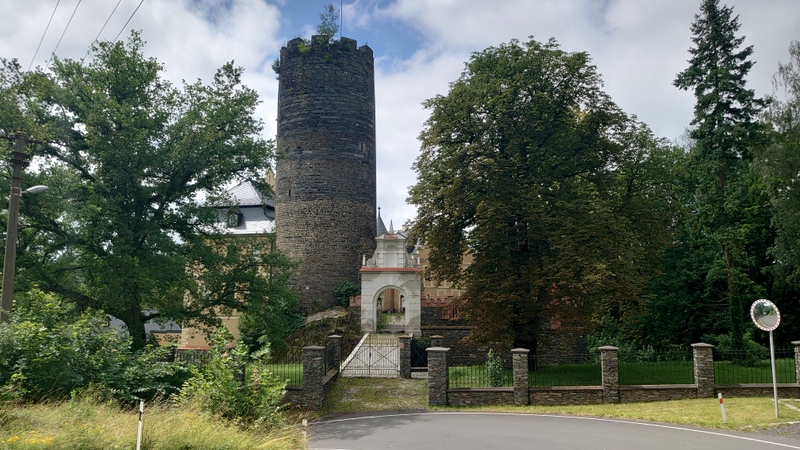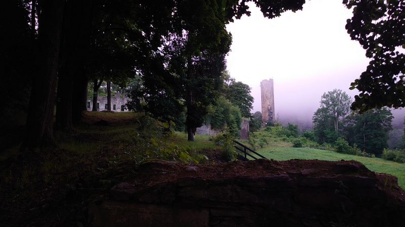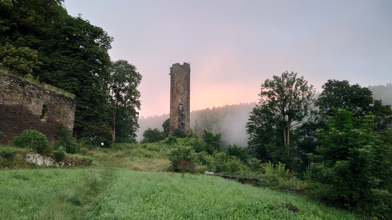 Škoda velmi rozlehlý vcelku zachovalý objekt byl by perlou Ašského výběžku. Věž uzavřená, nádvoří zarostlé, vedle stanovali též dobrodruzi, mlha začala tajemně klesat a my se rozjeli do závratných výšin…
