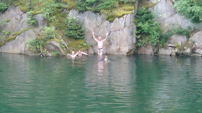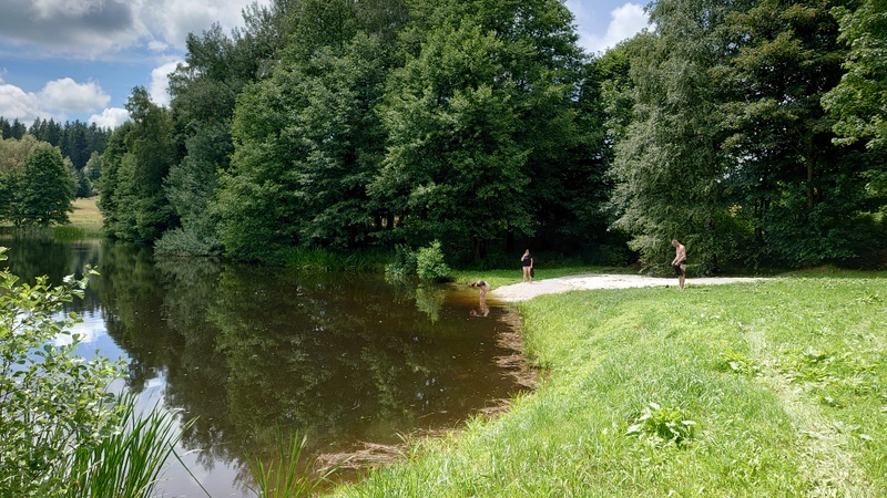 U Pastvin se zvolila stezka k 707 m vysokému vrchu Lom, od něhož jsme sjeli k Černému rybníku a vykoupali se. Všichni.