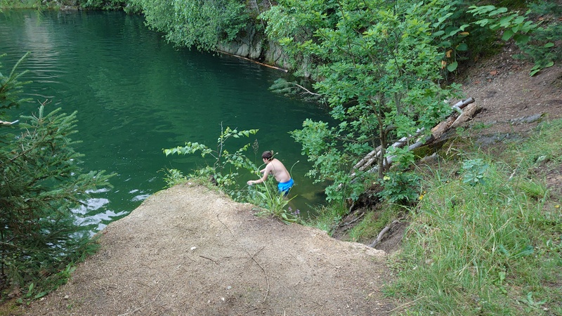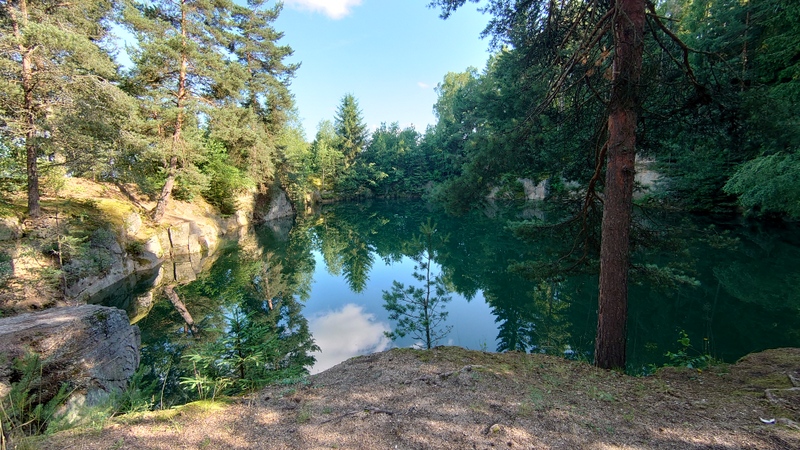 Několik kilometrů pohodlnou silnici vystřídala za Novým Žďárkem cyklostezka lesem Přírodního parku Smrčiny, jímž jsme dny projížděli. V pozdním odpoledni jsme se rozhlíželi kde se utábořit. Našel jsem dle map nějaký prostor s rybníkem, ovšem minuli jsme jej a za odměnu nás uvítal zatopený lom na kraji lesa u Polné.
