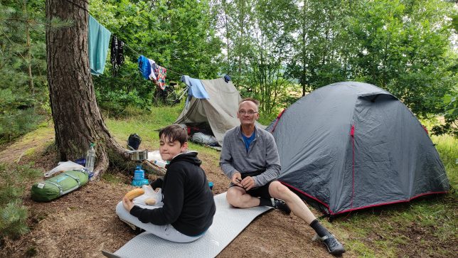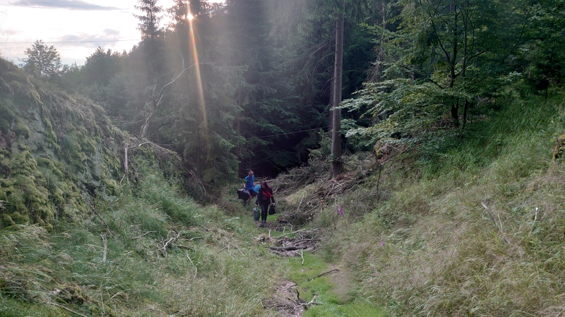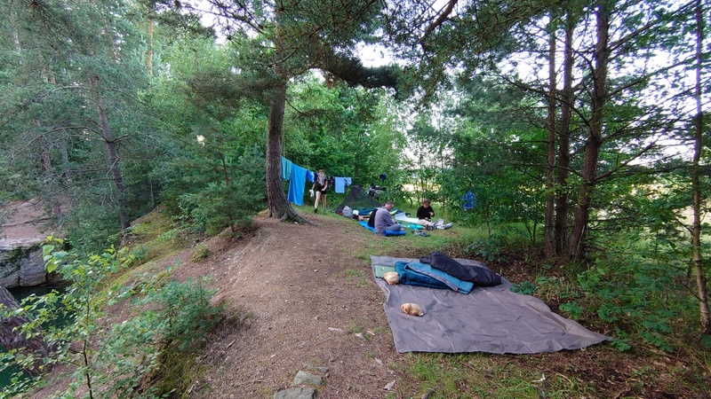 Popojeli jsme necelý kilometr a našli krásné posekané zákoutí schované za lesním porostem. Nechali jsme proschnout stan, plachtu, zbylé vlhké věci, navečeřeli se a po procházce místním úzkým lesem s podivně nahromaděnými kameny, šli spát.