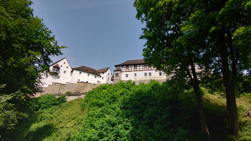 Jízda kolem krásně přestavěného hradu na zámek v Libé nás fyzicky vyčerpala. Jen Štěpánek se usmíval se šlapáním do kopce. Jednou ti baterka dojde ! Myslel jsem si a vedl kolo po silnici do stoupání. Abychom zařadili kulturní vložku, zaparkovali jsme oře o zábradlí v obci Ostroh a šli si prohlédnout hrad Seeberg.