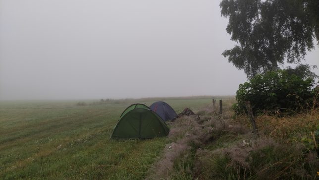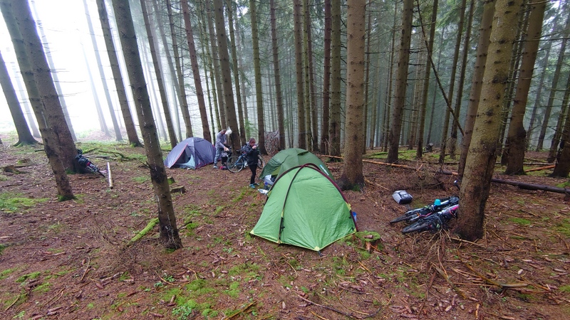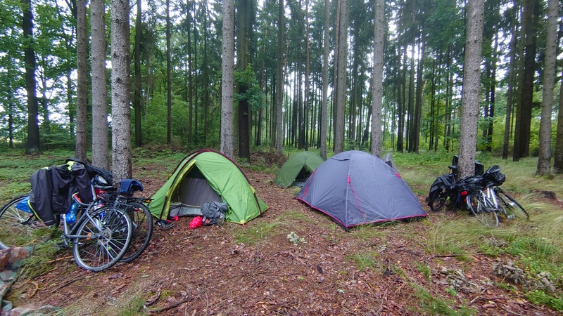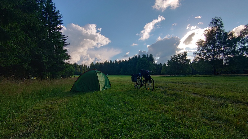 radil jet přespat k Sedmi rybníkům, což jsme nechtěli, stejně jsem omylem neodbočil na nesprávnou silnici a k rybníkům se přiblížili. Hledala se paseka mezi lesy, kde bude jakž takž rovný povrch. Nakonec se skupinka utábořila na vyjeté stezce na louce. Předpověď hlásila ranní přeháňky, proto na zeleném prostoru ve vysoké trávě vyrostly čtyři stany.