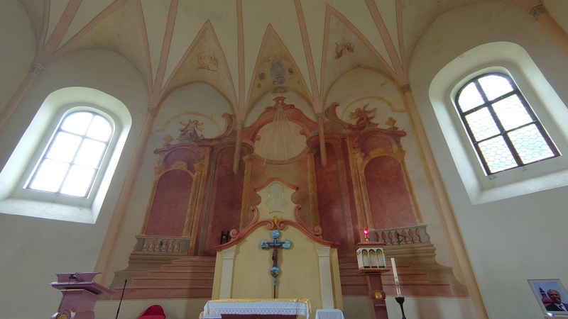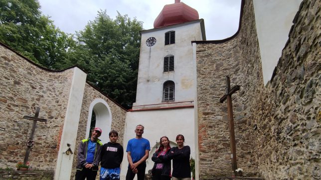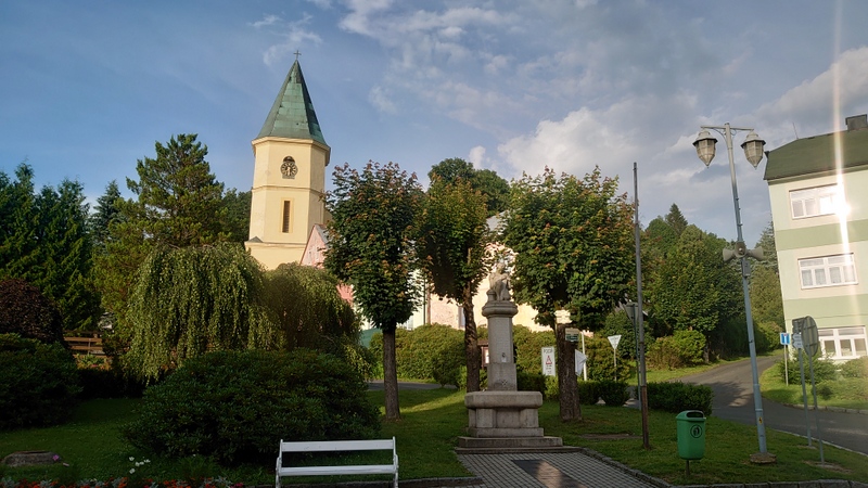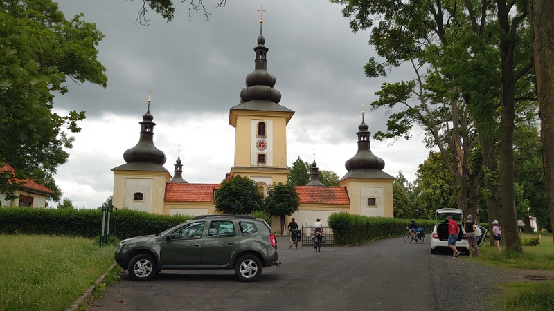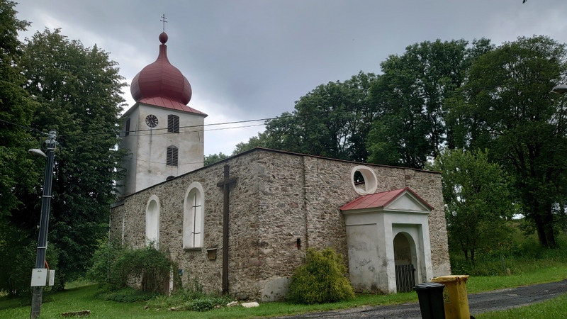Z torza kostela v románsko gotickém stylu se zachovala pouze věž s cibulovou bání, poněvadž po odsunu Němců v 1946 celý objekt chátral. Nyní je částečně obnoven. Štěpánek si zazvonil zvonem na pozdrav a my se rozjeli k dalšímu cíli dne. Před námi se rýsoval hřeben Slavkovského lesa s lázněmi Kynžvart ve stráni.