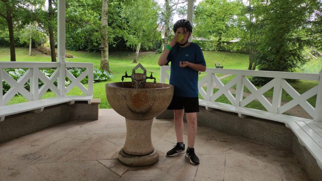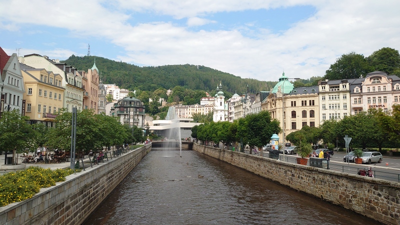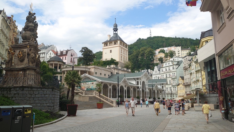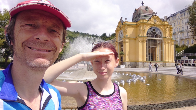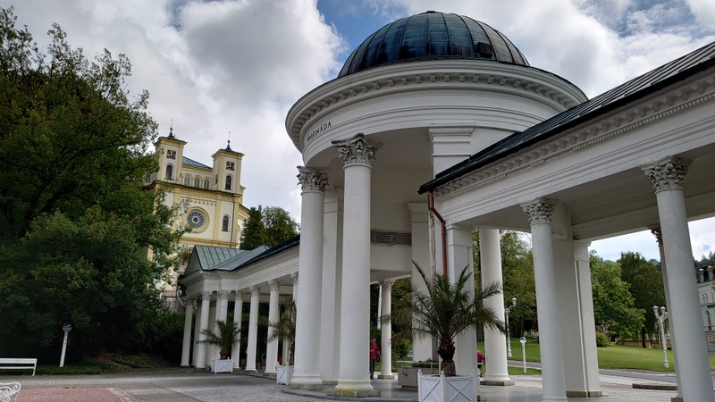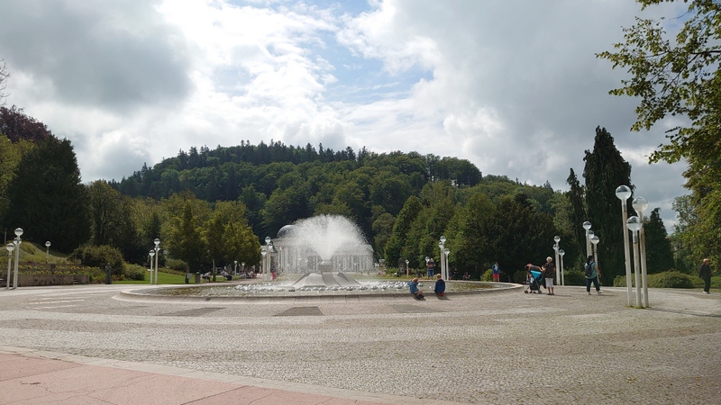 Rozloučili jsme se s Kynžvartem po značené stezce vedoucí po silnici většinou z kopce a za hodinku hleděli na předměstí Mariánských lázní. Vedlejší trasa vyhýbající se hlavní třídě nás dovedla na oblíbenou kolonádu lázní, kde se nachází hlavní léčivé prameny, zpívající fontána, řada obchůdků, atd.