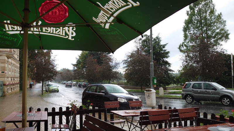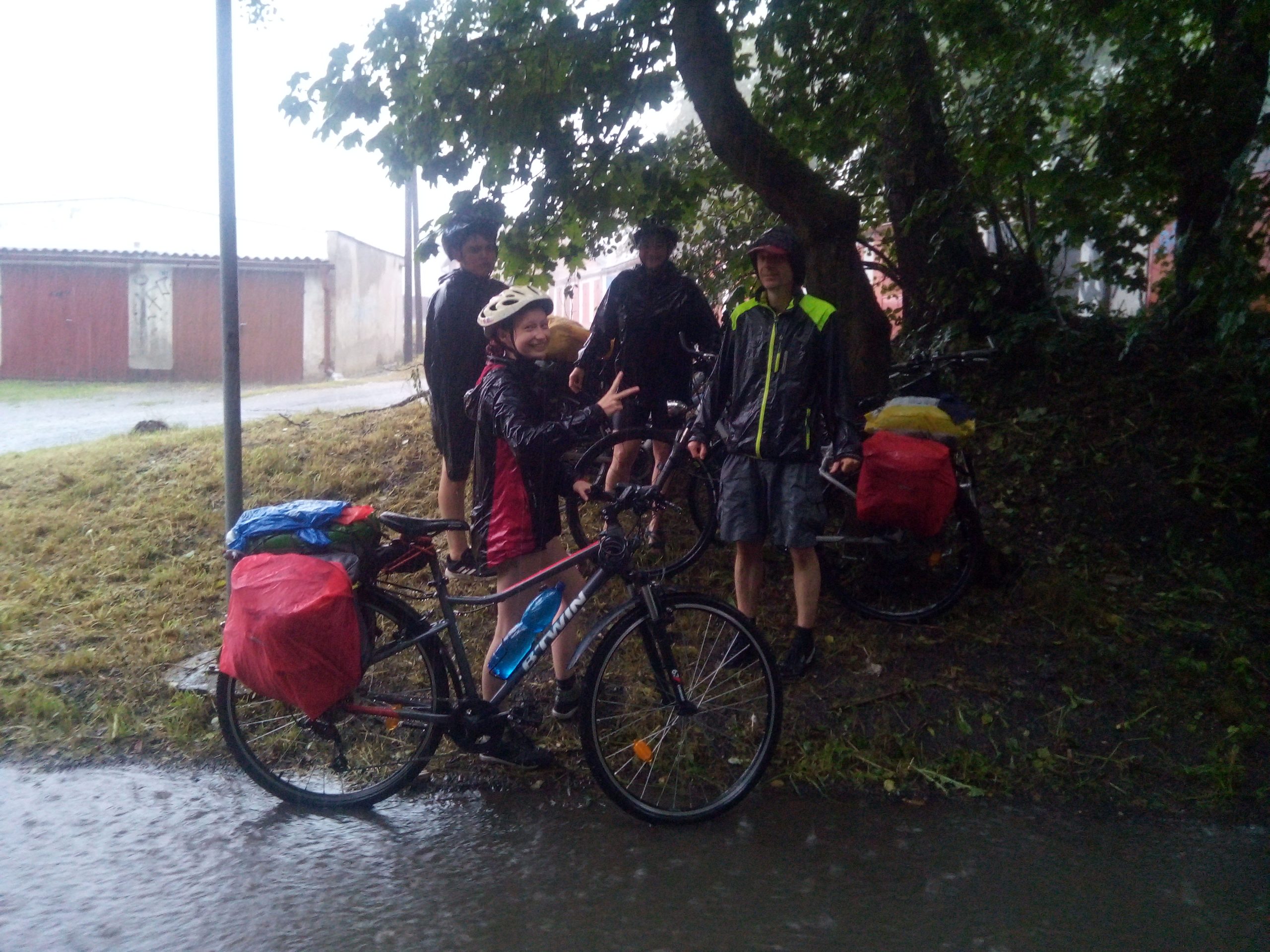Průtrž postupně ustala, ale dle radaru nebylo dost času k opuštění města. Zkusili jsme to, ovšem skončili jsme částečně promočení ve sportovní hale u čaje s koly schovanými pod slunečníky. Situace byla neřešitelná. Do kraje se valily vlny deště bez ustání mezi nimiž se prodlevy téměř nevyskytovaly. Nezbývalo než jít do rizika. Brašny se obalily proti dešti a po mírném odklonu srážek se rychle putovalo směr Háje. Nebe temně šedé připravovalo se na závěrečný doraz. Projížděli jsme pod železničním přejezdem menším tunelem, kde jsem radil počkat než se bouře přežene. Všichni se chovali jakoby se nic nedělo včetně Anežky, jež v tom vidělo dobrodrůžo. Asi si mysleli, že průtrži ujedeme. Rozjeli jsme se po cestě mezi pole a ucítili první kapky. Sám jsem se vydal vpřed co nejrychleji s nadějí přístřešku, ale nic. Otočil jsem směr a při vracející se jízdě zpět k nim jsem nabádal partu znovu obrátit se k návratu do tunýlku. Vyjádření, že jsou stejně promočení, mne silně naštvalo, ale nic se nedalo dělat. Pozdě pochopili, že v takovém marastu průtrže ani mobil displeje nefunguje. Voda pronikala úplně všude a nebýt zastavení pod listnatým stromem u křižovatky, pod nímž se prudký liják tříštil, vezli jsme v brašnách i vodu.