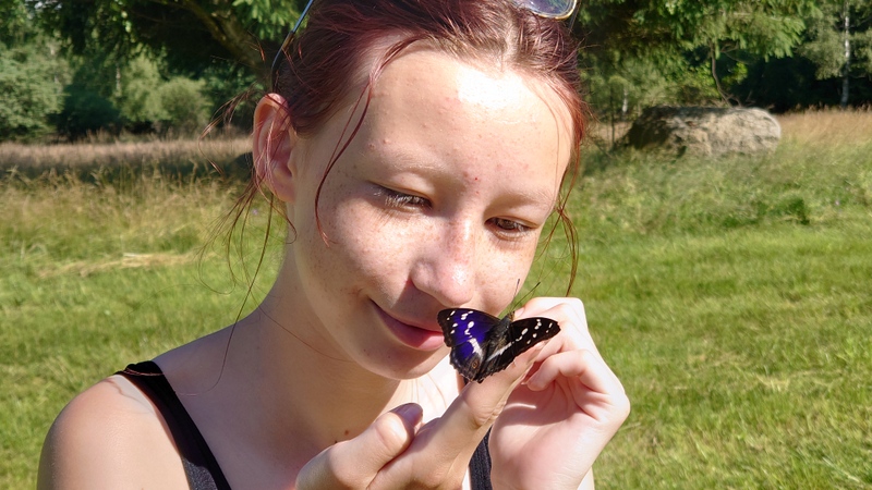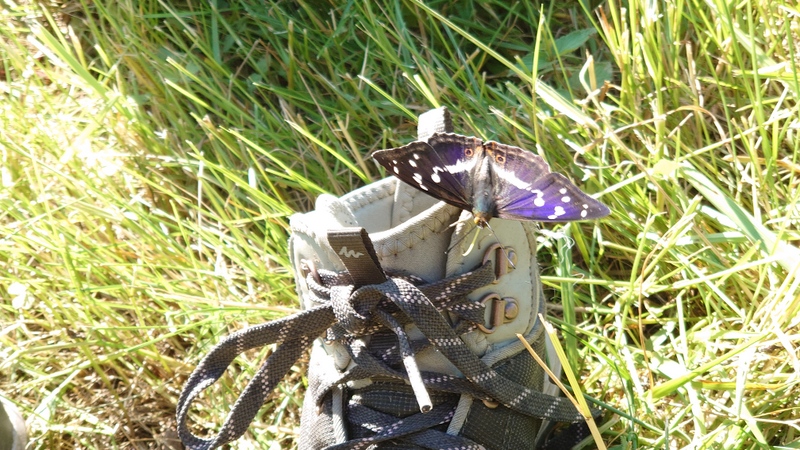Pestrobarevný motýl si usmyslil, že Anežce předvede svoji černofialovou nádheru na zádech. Vůbec se nebál dívčiných pohybů ač seděl na její botě nebo rozevíral své perutě v dlani jeho obdivovatelky. Snad by s námi odjel na kolech, kdyby si nevzpomněl kam patří. Cesta po vedlejší krkolomné silnici III. třídy lemovaná záplatami vyústila prudkým sjezdem k městečku Bečov nad Teplou.