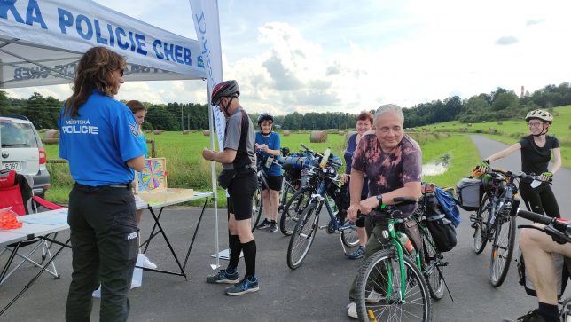 Městská policie nás poučila o bezpečnosti v dopravě formou otáčecího kola alá Mountfield, z něhož si kdo chtěl vytáhl otázku. Odměnou nám byli odrazky na kola a různé bezpečnostní prvky pro cyklisty. Cesta ubíhala přes malebnou vesničku Třebeň na sever ke geologickému parku SOOS.
