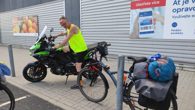 Už se mi dlouho nestalo, aby nás lidé honili za jídlem k tolika zavřeným restauracím. I když jsme se rozdělili horko těžko se našla hospoda. Nakonec se vybrala z nouze ctnost – Pizzeria pod hotelem Goethe. Po obědě se doplnily zásoby jídla v Tescu, kde si Vladimír málem spletl svůj bicykl s motorkou. Jo, to slunce!