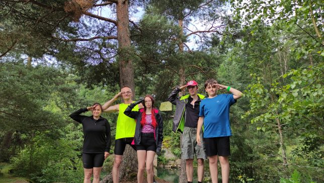 Navzájem jsme si pomohli a před sebou spatřili na vršku mýtinu. Výzvědné komando obhlédlo situaci. Terénní nerovnosti s pařezy nás vyvedli z omylu, stanovat zde. Rozhlédli jsme se po okolí za padajícího šera. Nedaleko od hradního příkopu v lese se naskytla rovinka pro tři stany. Obydlí se postavila během chvilky, navečeřelo se a hurá spát.
