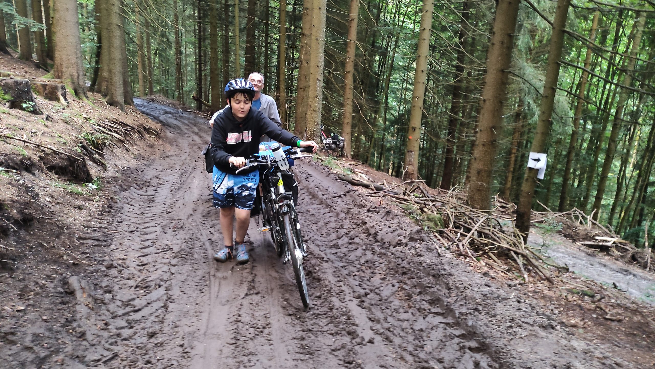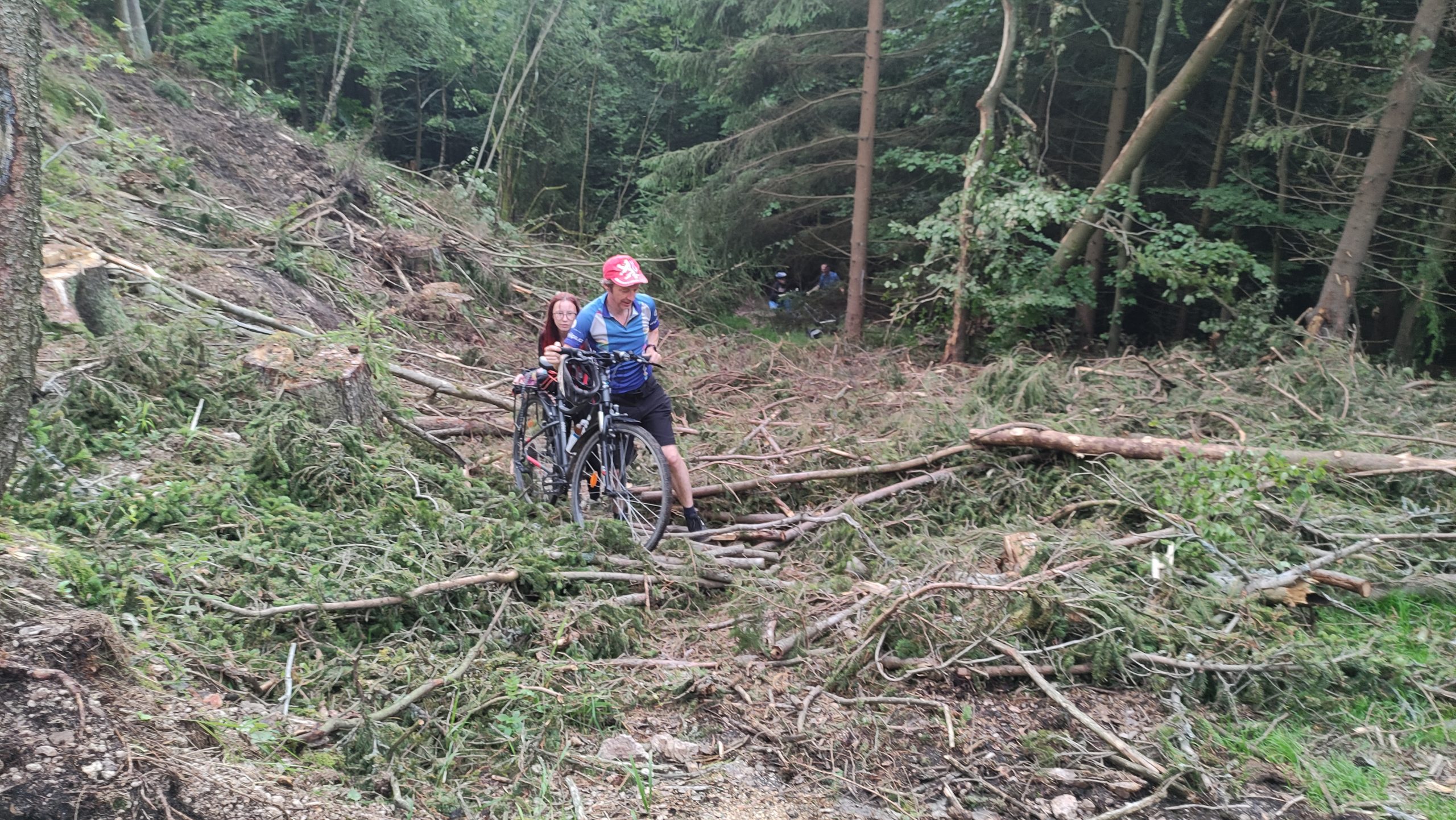 Zastavila se u nás městská policie s otázkou pomoci. Nevím jak by nám pomohli, ale s poděkováním odjeli. Štěpán se z přívalu hroutil a jeho vzlyků nebylo konce. Srážky ustávaly, načež my našplouchli na kola snažíc se loužemi projet někam naslepo. Z okolních zahrad se řinula voda přes ploty a brala s sebou hlínu se štěrkem. Anežka sundala zbytečné brýle, Štěpán se pokoušel zvládnout sebe i jízdu, Šárka pokoušela najít místo úniku. Jestli se někomu chtělo fotit, tak Vláďovi, jenž se pokusil částečně zachytit náš beznadějný stav. Z oblak postupně přestalo padat a my se co nejrychleji museli dostat někam na zalesněnou plochu. Mobil mi opět fungoval a navedl mne do lesíka u Slapan.