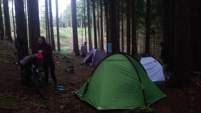 Pak se trasa opět zvedala, načež jsme sesedli z kol a vedli jej Na cestě k trojstátí. Byl nejvyšší čas nalézt přespání, což se po dvou kilometrech jízdy podařilo. Několik metrů nad autobusovou zastávkou Hranice, Trojmezí, na rovném poli u samostatného neobývaného domu  vyrostly přes noc tři stany. Od dnešního cíle jsme se nacházeli jen pár kilometrů, proto nebylo třeba nijak další den kvaltovat.