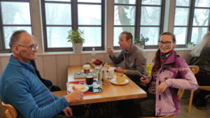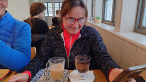 Mezitím co si parťáci odskočili navštívit tamější kostel, já jsem v teple kavárny hlídala věci. V útulném prostředí jsme doplnili ztracené kalorie, přeposlali si vzájemně fotky na své chytré telefony a v příjemném relaxačním rozpoložení si nechali utéct čas do odjezdu autobusu, který se konal v 15:54. Hladce proběhl i přestup v Tanvaldu, na který jsme měli díky zpoždění busu místo 5 minut pouhých 30 sekund, a v 17:23 už jsme v liberecké tramvaji mířili k našim domovům.