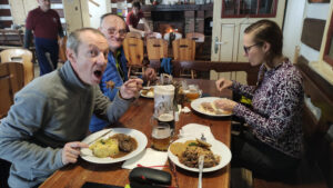 Dalším hlavním bodem dneška bylo občerstvení na Prdku. Díky volbě kratší trasy (velkým dílem kvůli mému rychle narůstajícímu hladu zvítězila varianta „rychlejší“) a klesajícímu terénu jsme dorazili na místo již v 11:15, což byl skvělý čas pro to, abychom si mohli vybrat nejlepší místa v téměř prázdné hospůdce a byli rychle obslouženi. Dali jsme si (kromě Aleše) „domácí“ pivo a za chvíli jsme k němu mohli baštit i jídlo, přičemž všechny výběry jsme ohodnotili na výbornou.