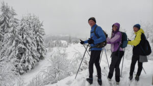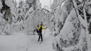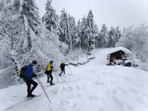 Dosud jsme měli štěstí na ryzí přírodu bez turistů, což se záhy začalo měnit, poté, co jsme doklesali od Štěpánky k Turnovské chatě. Ničemu to však nevadilo – k našemu dalšímu cíli, kterým byla Bílá skála, jsme beztak dorazili sami, v majestátním tichu zasněžené přírody. A to převážně upravenou trasou, pouze poslední krátká část byla turistická až terénní, tudíž záživná (stoupání však mírné, takže nic světoborného, až na lezoucí Šárku a Aleše na kameny).