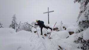 Díky stoupajícímu terénu jsme se brzy zpotili, sníh se nám občas lepil na prkna, ale dobrá nálada nás neopouštěla, a to ani při závěrečném výstupu až k samotnému úpatí Štěpánky.