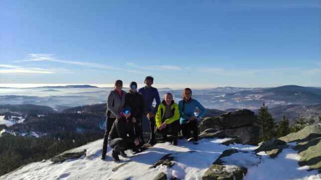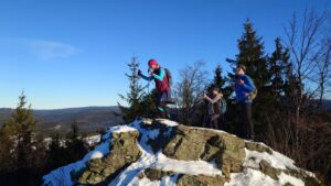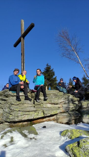 Tentokrát jsme ke skále dorazili po vyšlapané cestě, na jejímž konci nás čekali dva návštěvníci, kteří se již oddávali výhledům na tomto krásném místě. Poté, co jsme také vyšplhali (bez běžek ovšem!) na skálu a usadili se na místech, nechali jsme se unést spontánními výlevy citoslovců značících nadšení, rozhlíželi jsme se po krajině a hojně fotili. Dojem výhledů byl umocněn částečnou inverzí v dáli dodávající zážitku na mimořádnosti. Brzy po nás přicházeli další turisté, o skálu byl dnes evidentní zájem. Spolunadšenců jsme využili ve svůj prospěch a nechali si udělat hromadnou fotku (což jsme jim samozřejmě následně oplatili).