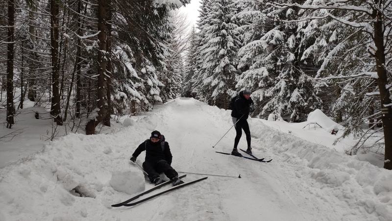 Opuštěné chalupy pokryté sněhem potvrzovaly nepřítomnost lidí a právě proto jsme se divili, proč je asfaltka směřující do Josefova dolu odhrnuta od sněhu. Klouzat se po ledu ze svahu na běžkách není dobrý zážitek, přinejmenším je sjezd neovladatelný. Nicméně opatrně a odvážně jsme sjížděli a hranili, jak to jen šlo. Kuba se Štěpánem neunesli sílu okamžiku a raději se pokořili pádem na zem.
