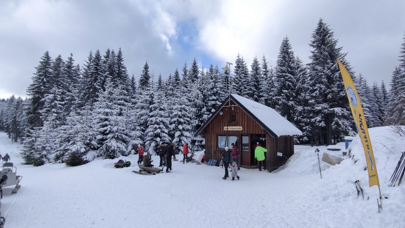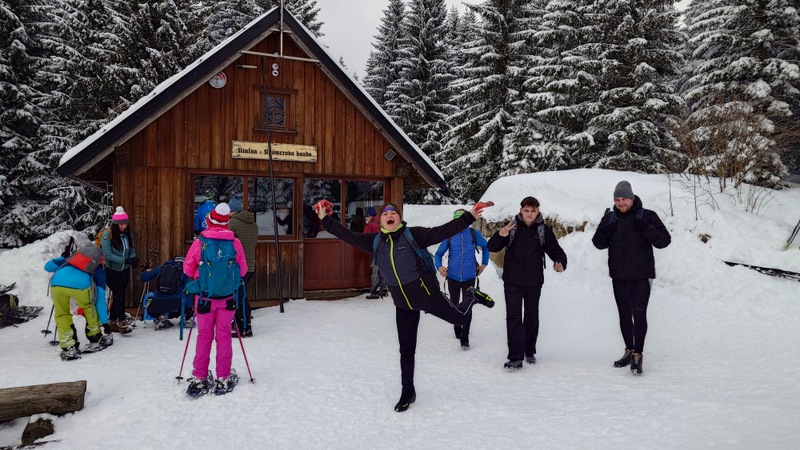 Kdo chtěl objednal si uvnitř vyhřáté chatky kávu, kofolu, čaj. Po sváče následoval poslední výstup na Mariánskohorské Boudy.