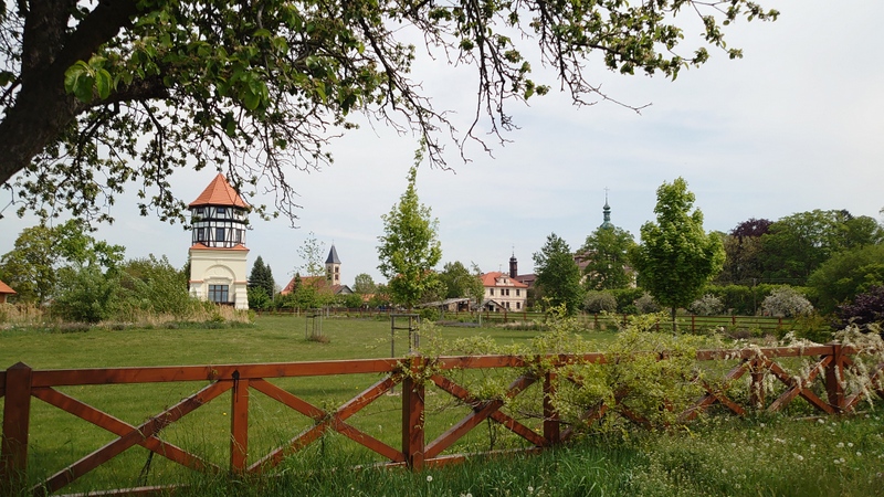 Na návsi zaparkovali s úmyslem nákupu ve smíšeném zboží v čele s vietnamkou. Skoupili jsme drobné pečivo s různými saláty a dali si na lavičce oběd. V parku jsme si na sluníčku dáchli při odpolední kávě.
