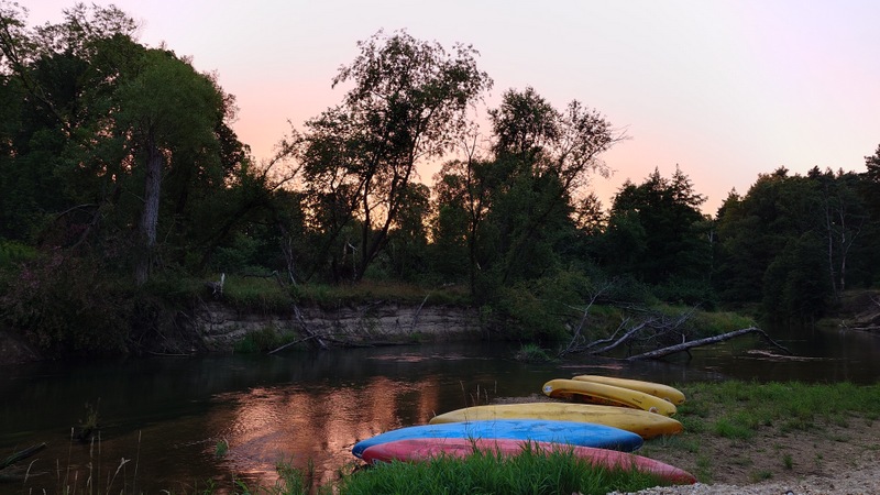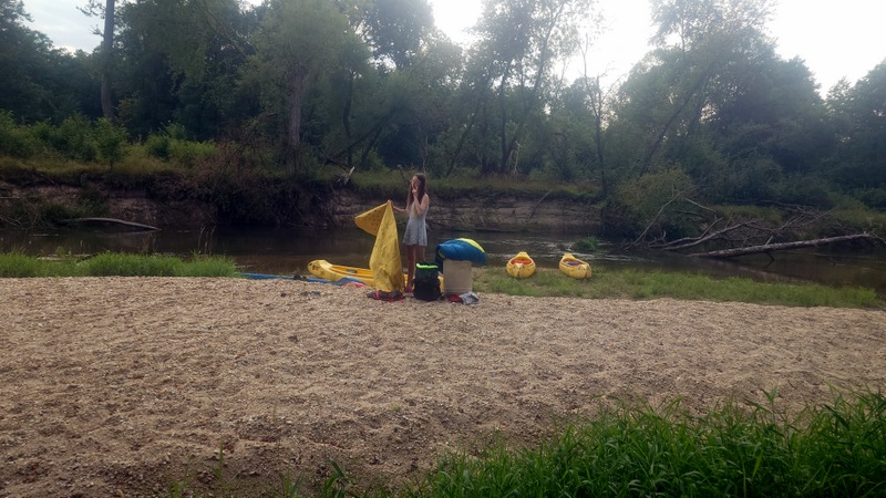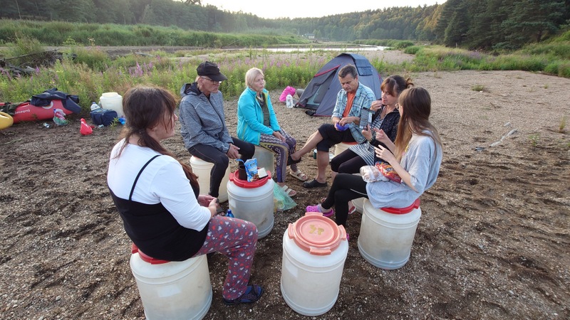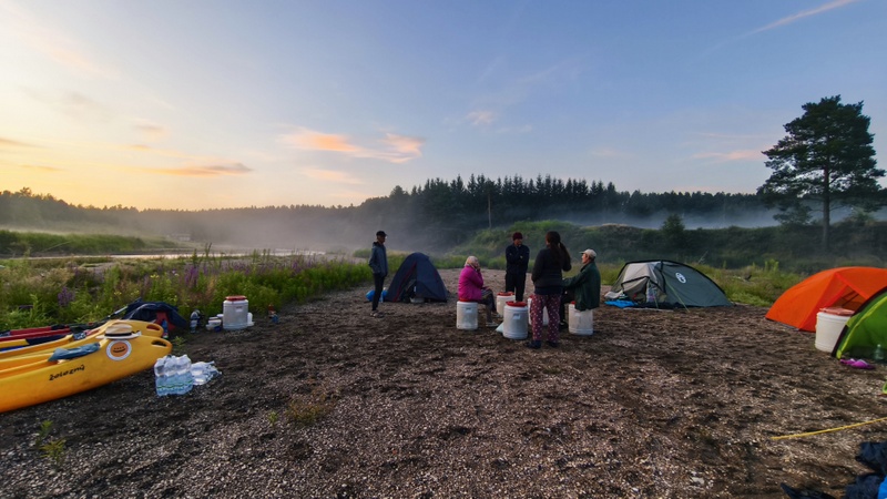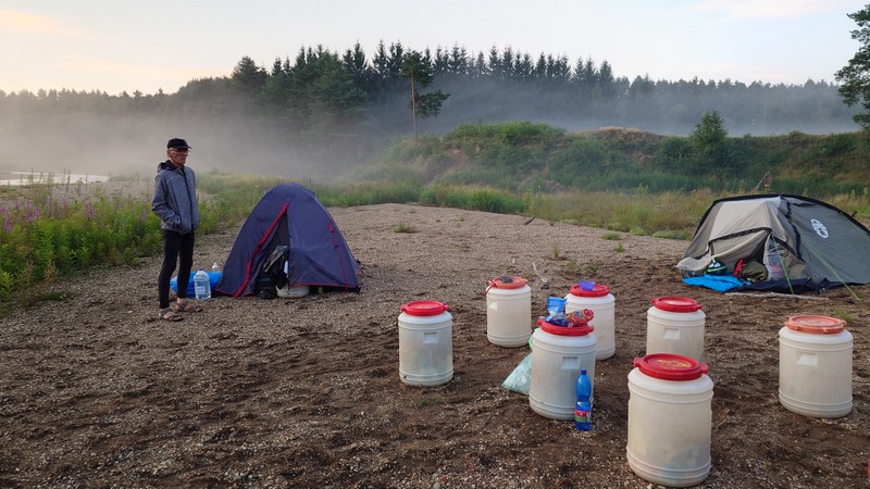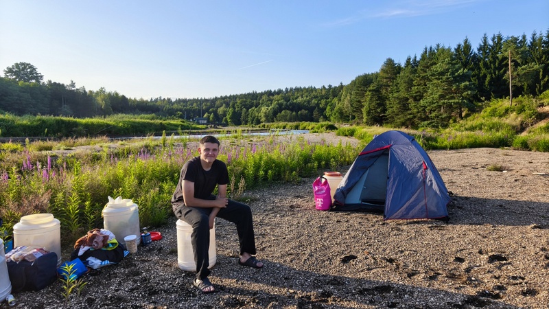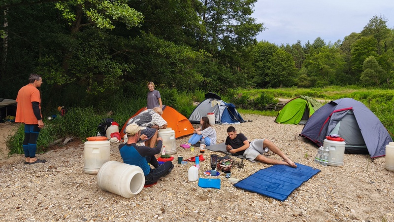 O půl sedmé vodáci dopluli k bývalé přehradě na jejímž dně se rozrostly stany. Přálo nám i sluníčko hřející nám do zad při úpravě obydlí a chystané večeři na sudech.