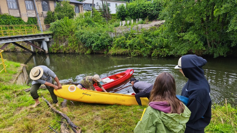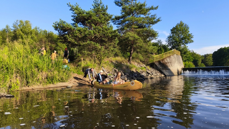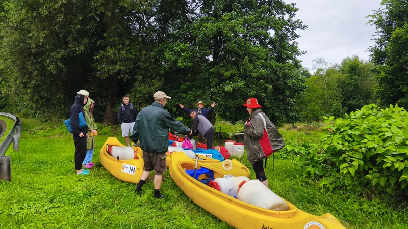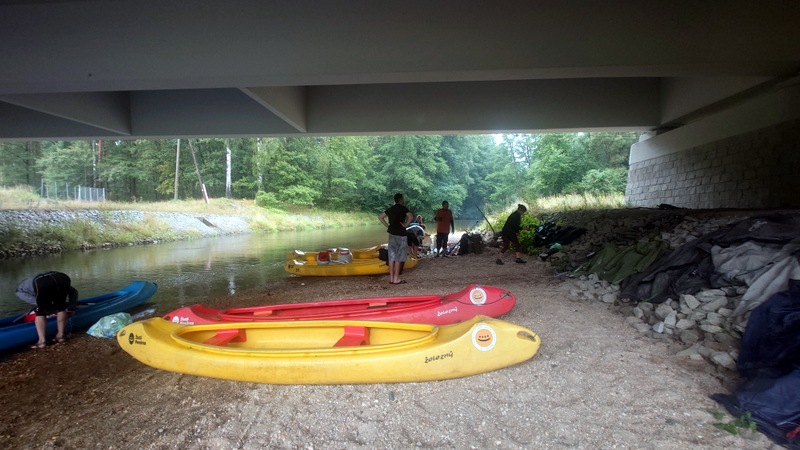 Plánovalo se doplout maximálně do města Zaháň/Žagań. Lodí vyplouvalo pět s devíti osobami. Jak se plavidla obsadila? Červená kanoe Jirka s Ivetou, žlutá k. Klára s Anežkou, modrá k. Vláďa se Štěpánem, žlutá k. Aleš s Jiřinou, žlutá k. Šárka s barely. Při příjezdu našimi dvěma auty za město Nowogrodziec ještě chvíli pršelo, čas na kávu. Jakmile dopravili kánoe s vybavením, obloha se zdárně snažila vymanit se s oblačného sevření. Vyplutí začalo v 10h přesně tam, kde jsme loni skončili.