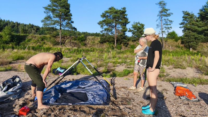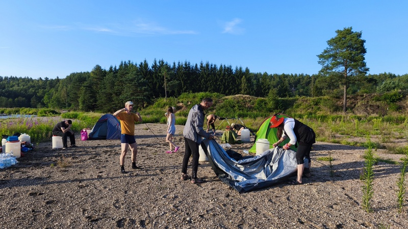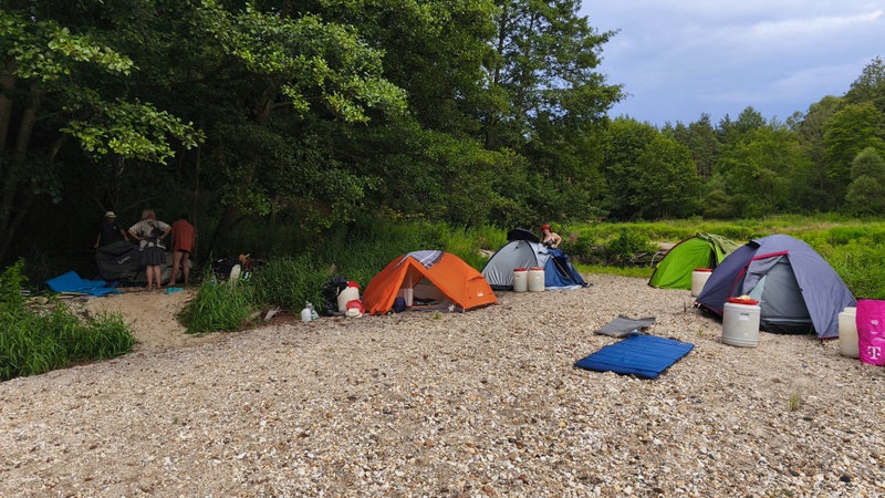 Rozhodla většina, která s chutí postavila stany na prostoru kam řeka při velké vodě naplavila velké množství oblázků mezi nimiž se objevila i roztavené valouny průmyslového skla. Jirka prozíravě postavil stan v úkrytu lesa, protože věděl, že obydlí dlouhodobě nevydrží prudký slejvák.