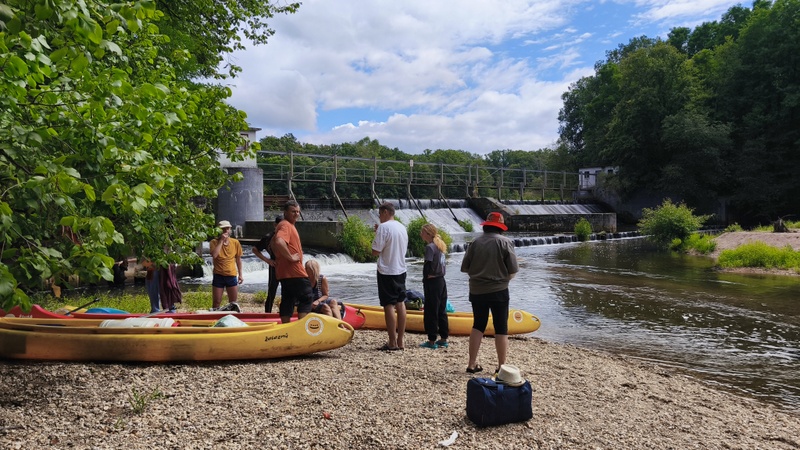 První z několika jezů, a co jich opravdu bylo, jsme zvládli přesunutím lodě kolmo ke splavu. Silní kluci mi dolů posunovali po koruně jezu kánoe, které jsem pak opatrně spouštěl podél břehu ostatním.