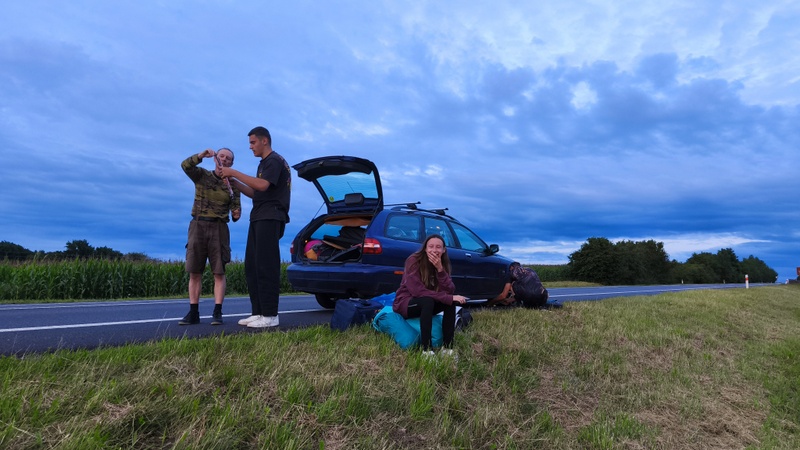 Autodoprava kánoí si odvezla na čas svá plavidla a my čekali přes 75 minut na řidiče. Po půl sedmé jsme se rozloučili a každý svým vozem jel svou trasou domů. Nám navigace ukázala trasu přes Zagań, Zhořelec a Hrádek, za nímž se nám navíc stala nemilá věc. Píchli jsme přední kolo.