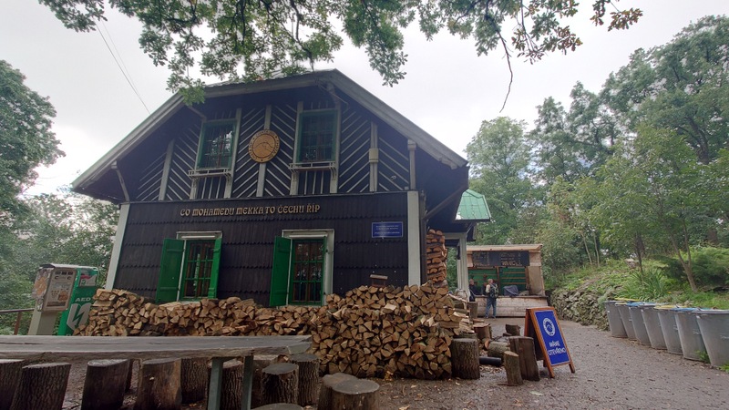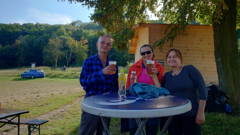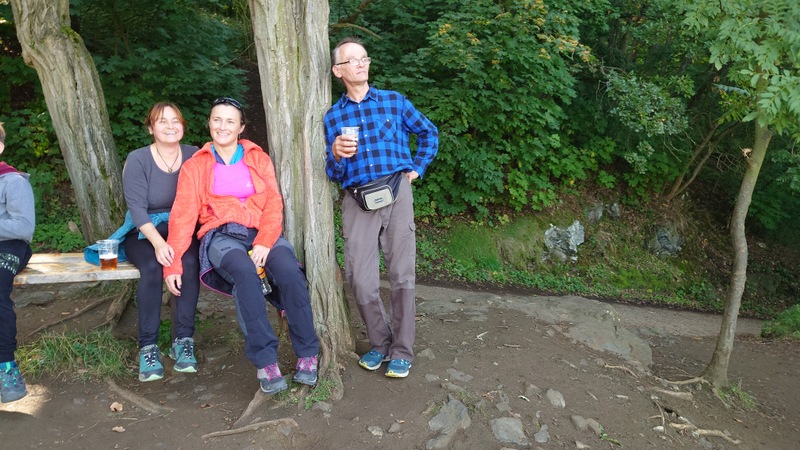 Zpoceni jsme odpočívali u stánku s občerstvením, u něhož jsme požádali o hlídání krosen před výstupem. Anežka se rozloučila, spěchajíc na spoj odjíždějící za hodinu z Roudnice.