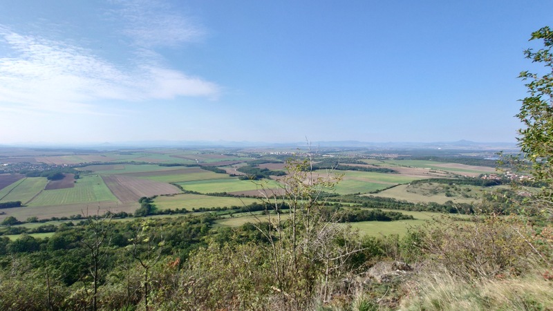 Přes jisté zahalené kouřmo byla spatřena Milešovka, Házmburk, Lovoš, Roudnice atd. Čas ubíhal nemilosrdně pro Jarču, proto jsem nabídl shlédnout malou západní vyhlídku na Pražskou kotlinu při odchodu ze Řípu. Vzdálená Mělnická tepelná elektrárna se naparovala se svým bíle doutnajícími komíny, vpravo se nacházel Mělník a přímo pod námi Ctiněves, Mnetěš, Krabčice, Kostomlaty aj. vesnice. Sešli jsme k občerstvení pod Řípem, rozloučili se s Jaruškou a já ji doprovodil do Vesce. Po návratu jsem našel zbytek na louce, na níž se vyhřívali odpoledními slunečními paprsky. Nadešel čas nalezení místa, které jsem si připravil minulý víkend. Kráčeli jsme vyšlapanou pěšinkou v kukuřičném poli, jež vyústila na louku, na jejímž konci mezi dvěma lesíky byl ideální prostor k postavení stanů.