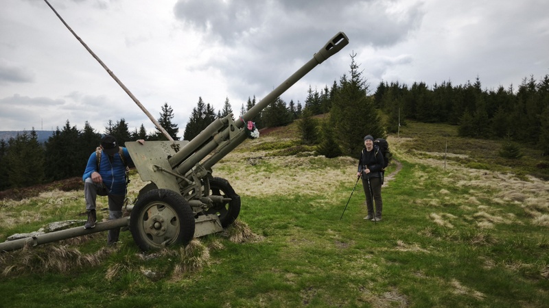 Až vrchol Rázsočná 1204 mnm zjemnil stoupání k dalšímu bodu Úplaz 1301 mnm, pod nímž vedl budoucí silniční tunel. Vpředu šlapali Tomáš, Štěpán já za námi Ivča s Diegem pak Vladimír a skupinu uzavírali Šárka s Martinou. Přestávky byli častější, neboť naše unavená záda dostávala zabrat. Cíl na Velké louce se blížil a tím naděje na odpočinek. Překročili jsme vrch Minčol 1364 mnm s udržovanou houfnicí z druhé světové války,
