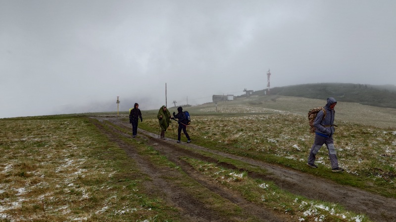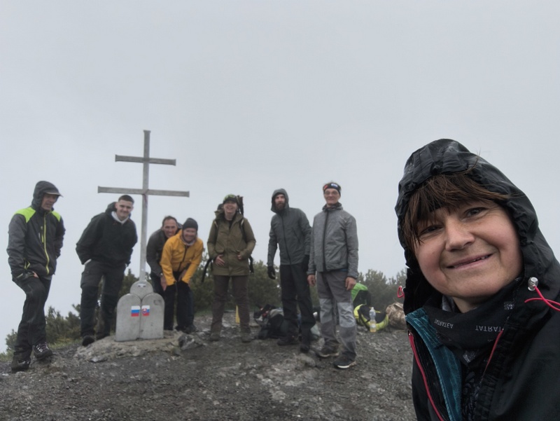 Společně se Štěpánem jsme lezli poslední a dalo to zabrat. Klouzavé bahno nedovolovalo rychlejší posun výše, přesto jsme vrchol zdolali a v 15.30 se fotili na holé pláni. Chladné oblačné počasí způsobilo spěšný sestup v pokračování ve směru po červené. Odhadovali jsme, kde asi naše menší půlka je. O to víc nás překvapilo náhodné setkání na rozcestí v úpatí kopce, z něhož jsme po kluzkém sestupu z vršku po blátě doklouzali. I je nepohodlná stezka zbrzdila v chůzi.