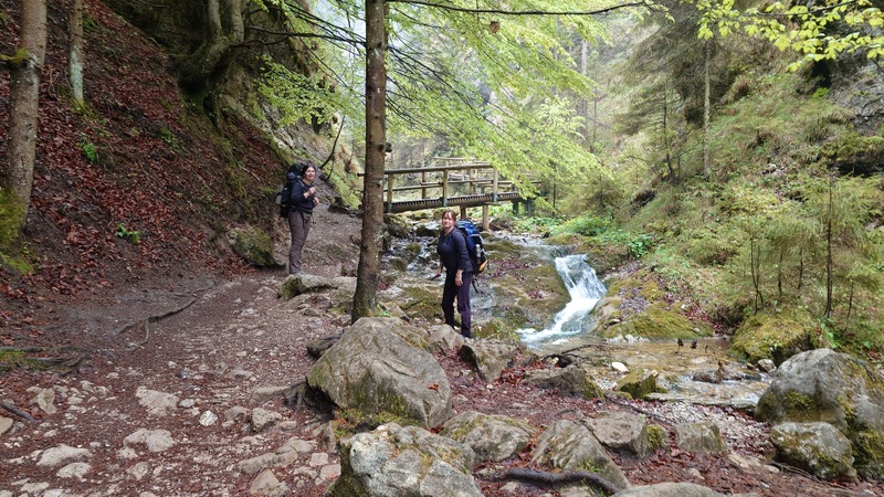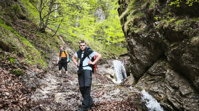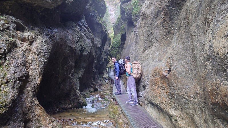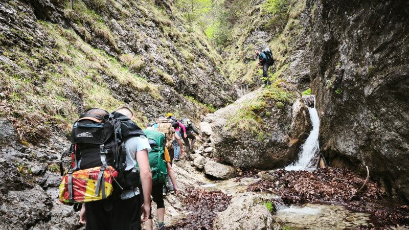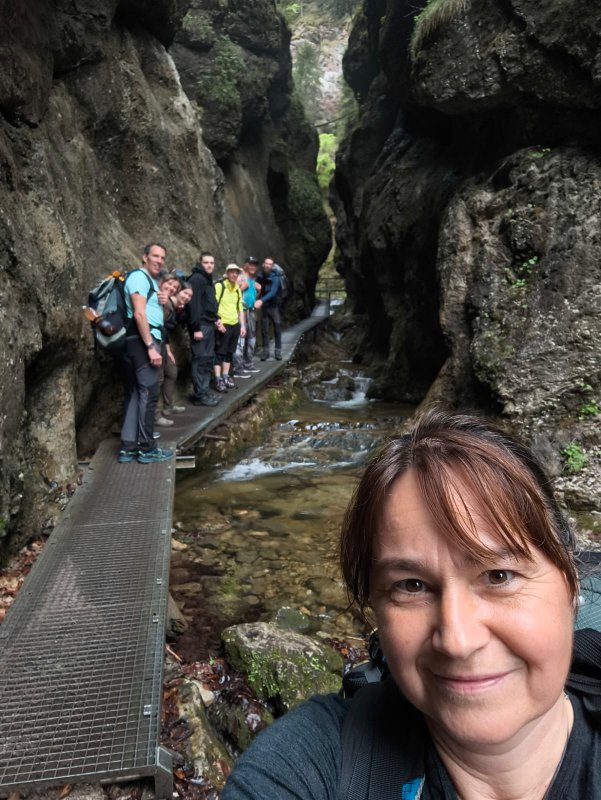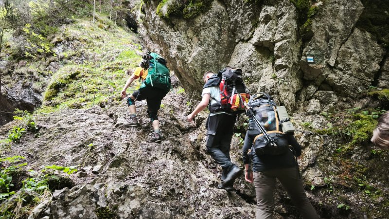 Škrábali jsme se mezi skalami po řetězech, jinde po kovových žebřících a pod námi protékal Hlboký potok.