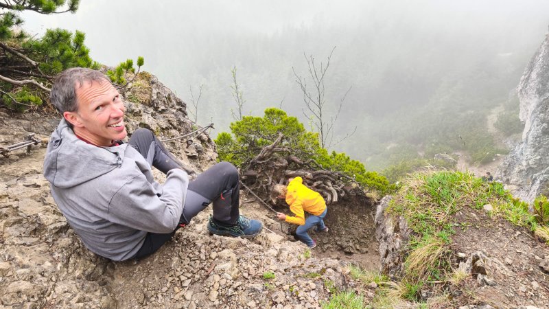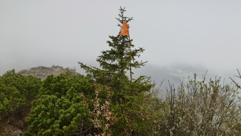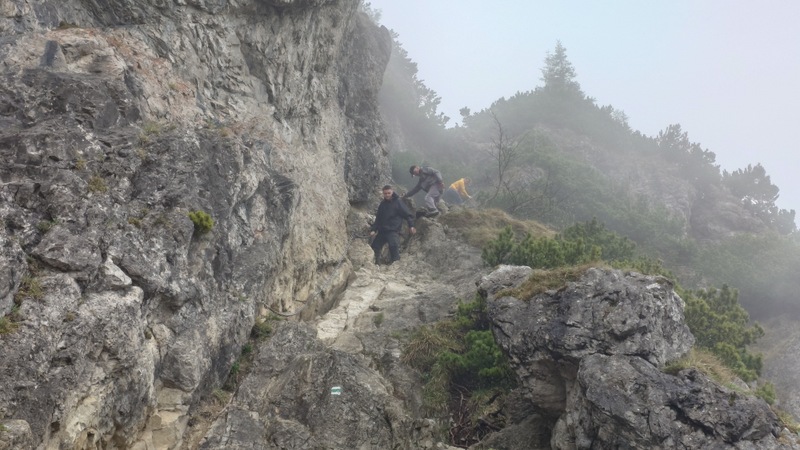Zde jsme se podivili nad mlhou zahalující Malý Rozsutec. V jeho úpatí se parta posilnila svačinou a ukryla batohy. Po 11 hodině nadešel výstup po řetězech na skalnatý vršek.