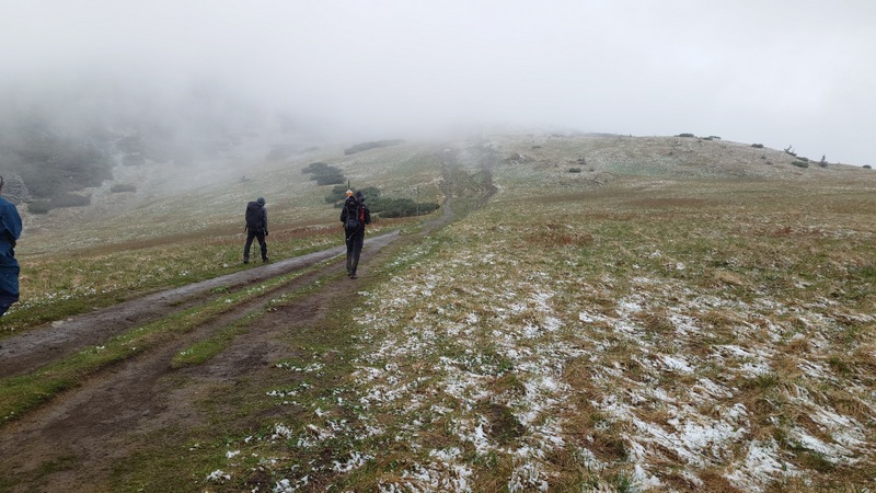 Jemně pocukrované vršky s plující mlhou mezi námi jen utvrzovaly, že na horách se počasí mění každým okamžikem.