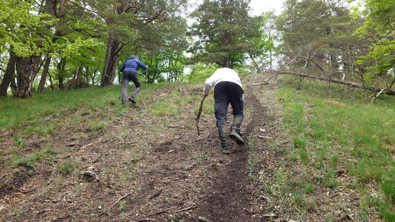 Nikdo by si nepomyslil, že budeme po obědě funět do prudkého svahu pod cca 60st náklonem několik set metrů. Pěší rychlost se zmenšila na nula nic.