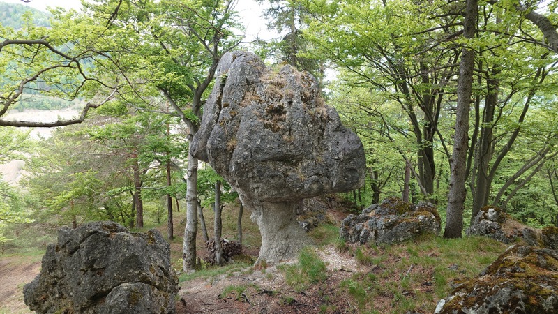 Nahoře na zalesněné ploše byla místa s částečným rozhledem. Zašli jsme mimo trasu na skalnatou zvláštnost – na Kojšovský budzogáň. Zvětralá skála ve tvaru obrovské houby.