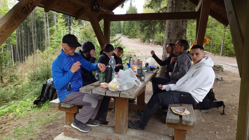 Zpocení jsme šplhali až k přístřešku v sedle Javorina. Zde se obědvalo ze zásob nesoucích se na zádech.