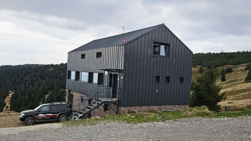 Moderně postavený šedivý objekt s velkými okny restaurace zřejmě sloužil v zimním období pro lyžování. Nyní jsme se ubytovali opět sami a pan majitel nám vysvětlil cokoliv. Voda neomezená, pokoj Vysielač s palandami,