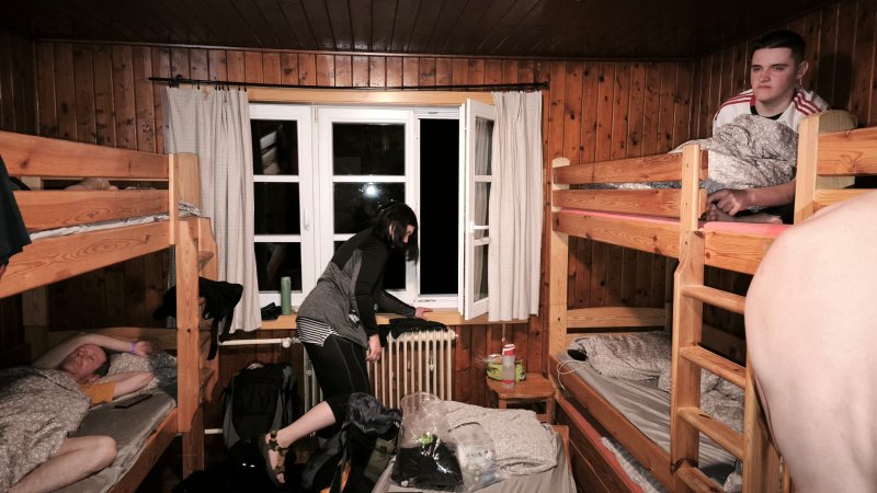 Na chatě pod Suchým jsme opět byli jediní návštěvníci, přesto nám nabídli dva pokoje po čtyřech. Parta se rozhodla na jeden s palandami, ač po rozložení postelí se naskytlo málo místa.