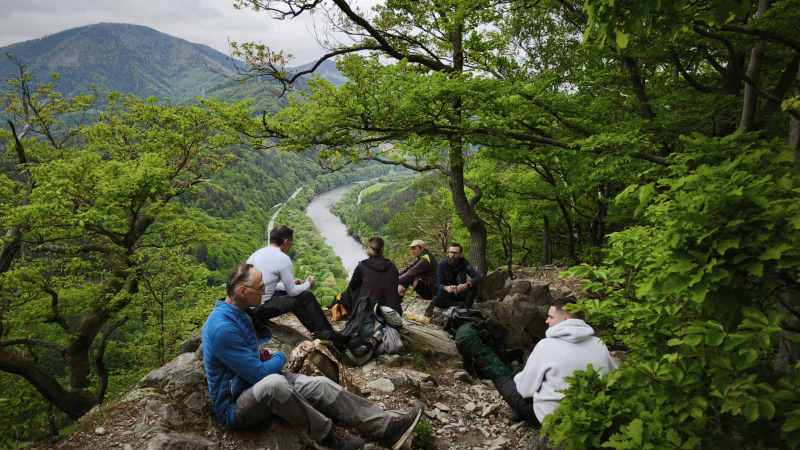 Při dopoledním výšlapu na prudkém svahu se zadýchávali všichni. Během hodinky jsme se rozhlíželi v dřevěné chaloupce po dalekém okolí nad Strečnem.